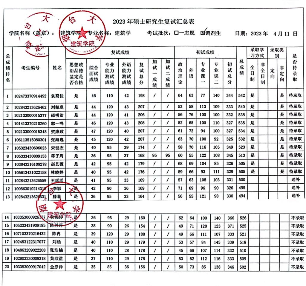 2023年烟台大学建筑学院研究生调剂复试成绩公示