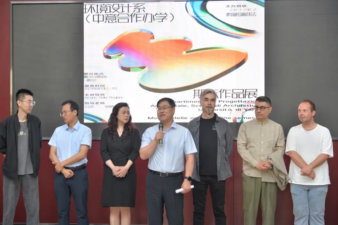 建筑学院院长隋杰礼在致辞中,高度肯定了参展作品的质量和同学们的辛勤付出,认为本次作业展充分展现了学院在师资力量、学生专业与文化素养、人文环境等方面大幅提升,希望通过合作交流产出更加丰硕的教学成果。随后,中方课程指导教师王金花和意方课程指导教师雅各伯分别讲话。