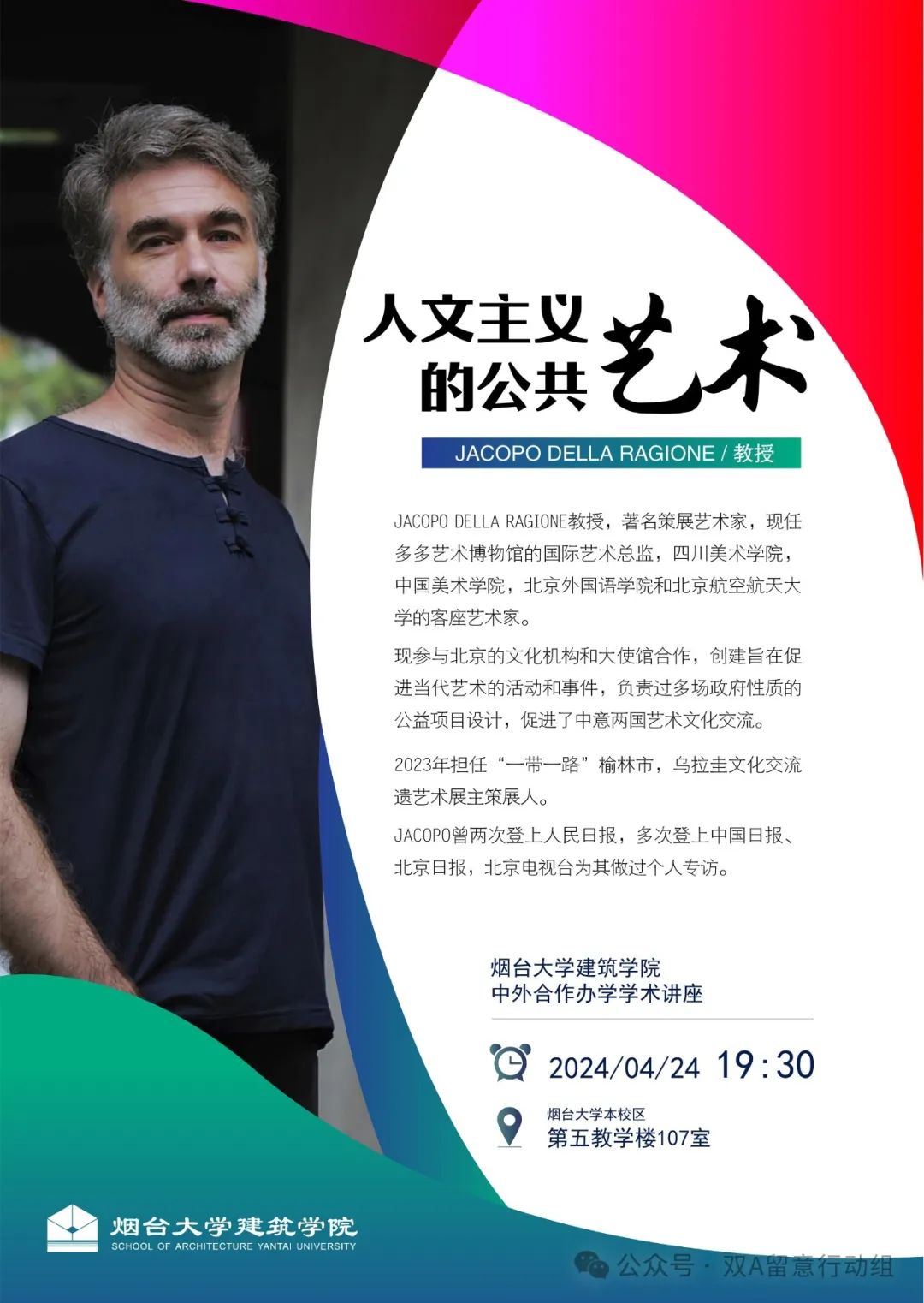 4月24日晚7点半,烟台大学建筑学院举行了一场主题为“人文主义的公共艺术”的精彩讲座。我们荣幸邀请到了知名策展艺术家、多多艺术博物馆国际艺术总监,以及意大利ACME美术学院教授JACOPO DELLA RAGIONE先生来到烟台大学,与我们共同探讨公共艺术在现代社会中的重要作用和意义。