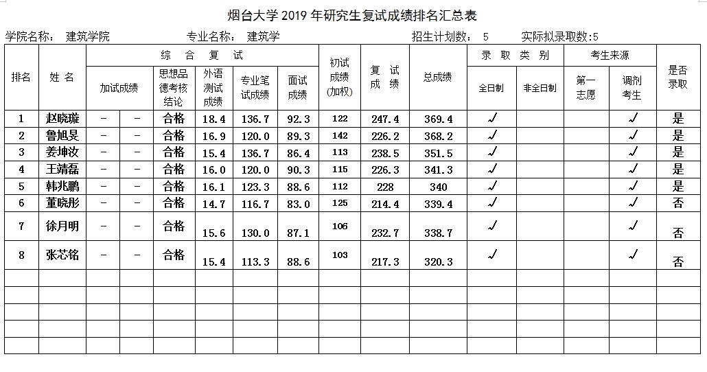 录取结果依据复试成绩排名汇总表,排名及录取情况见表格。因考生个人原因出现不接受或不满足烟台大学调剂情况的,名额依次递补,请保持电话通畅。
