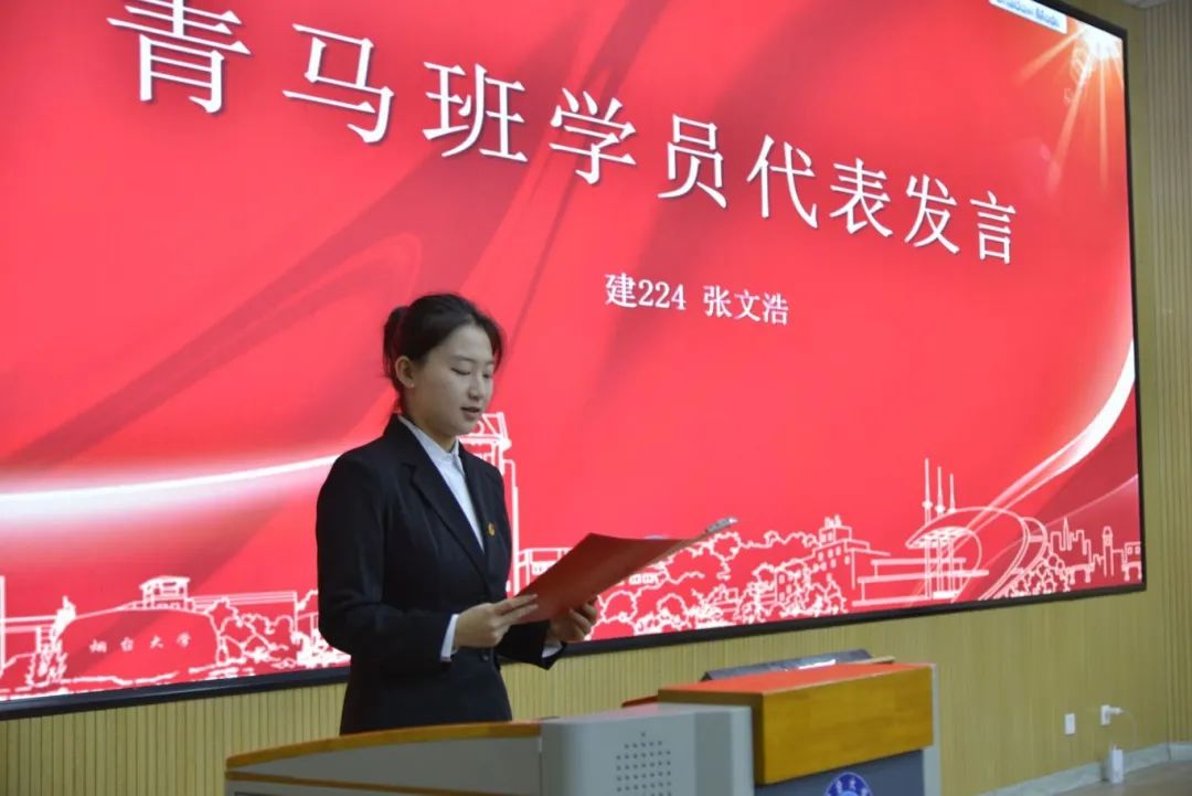 烟台大学团委老师杨倩在致辞中对本次开班仪式的顺利召开表示热烈的祝贺,号召同学们以“有理想”的“坚定心”锚定目标、勤学深研,以“敢担当”的“硬实力”勇于实践、接续奋斗,以“能吃苦”“肯奋斗”的“坚韧力”笃行实干、善作善成,以青马工程培训班为契机,读原著、学原文、悟原理,始终保持蓬勃向上的青春朝气,用掷地有声的作为书写无愧于时代的华彩篇章。