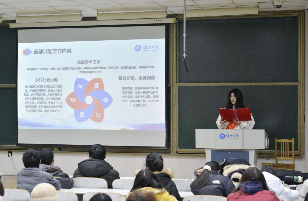大学生志愿服务西部计划由共青团中央、教育部、财政部、人力资源和社会保障部共同组织实施,每年招募一定数量的普通高等学校应届毕业生或在读研究生,到西部基层开展为期1-3年的志愿服务工作。本次活动主要介绍西部计划的背景政策、服务内容和发展前景,同时就同学们关心的活动任务、报名时间、方式、条件以及选拔流程等问题进行了详细解答。