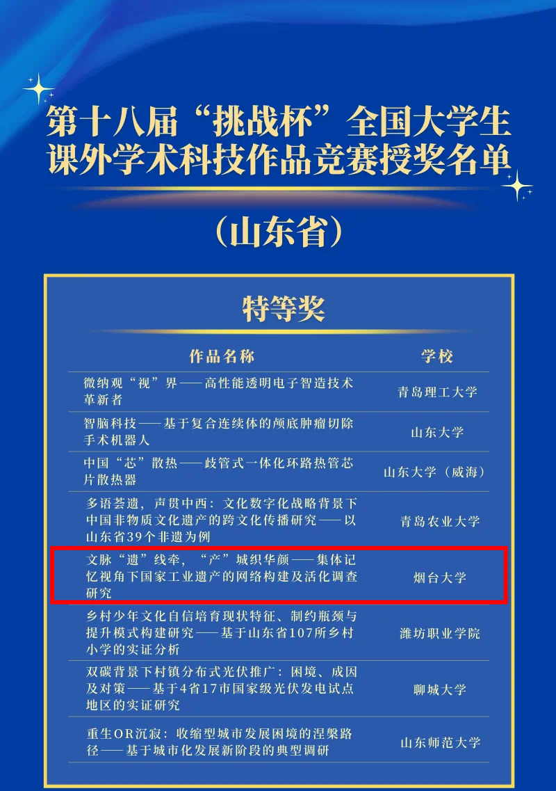 烟台大学参赛作品中,建筑学院团队的哲学社会科学调研报告类作品《文脉“遗”线牵,“产”城织华颜——集体记忆视角下国家工业遗产的网络构建及活化调查研究》(第一指导教师:王骏)获得特等奖。团队深入调研五批、194处国家工业遗产,创新性地提出了国家工业遗产网络“1+3+N”活化模式,探索工业遗产在中国式现代化进程中的创新发展路径,使其焕发新的活力。
