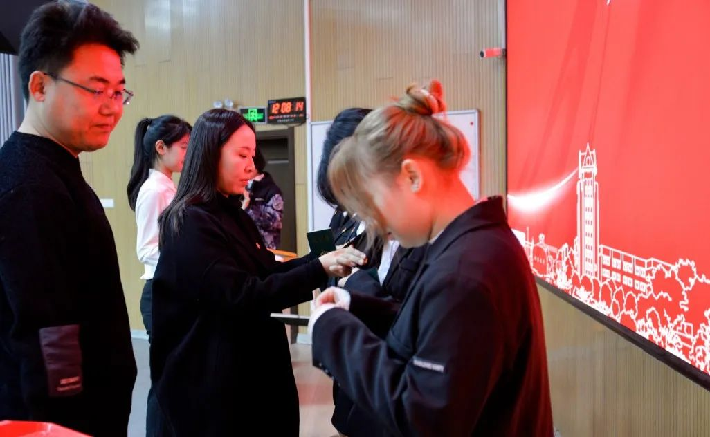 学院团委老师为新团员佩戴团徽、颁发团员证