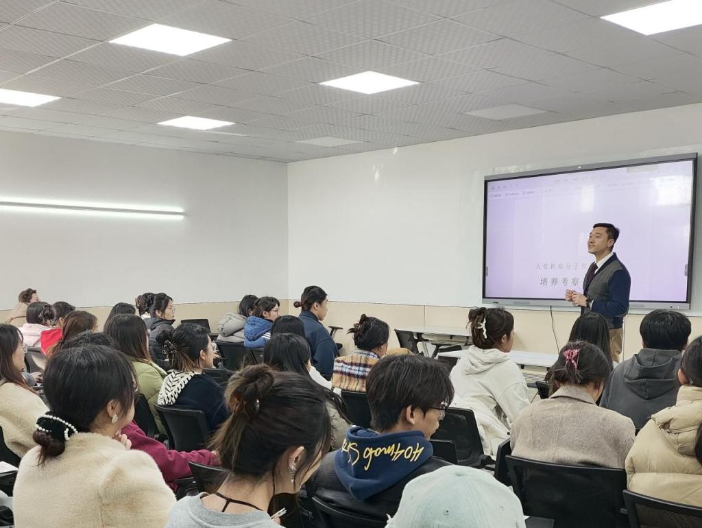 中国共产党自诞生之初,就秉持着推进集中学习教育的优秀传统。11月14日,组织员何盼老师以“历史的轨迹、入党的脚步”为主题,为全体学员作专题辅导。他从党的百年奋斗历程出发,系统梳理不同历史阶段党面临的主要任务与取得的伟大成就,帮助学员在历史纵深中理解党的初心与使命。何老师还围绕入党材料撰写规范与政治审查要求作了细致讲解,强调材料的真实性、规范性与思想性,为学员履行入党手续、做好思想准备提供了扎实指导。